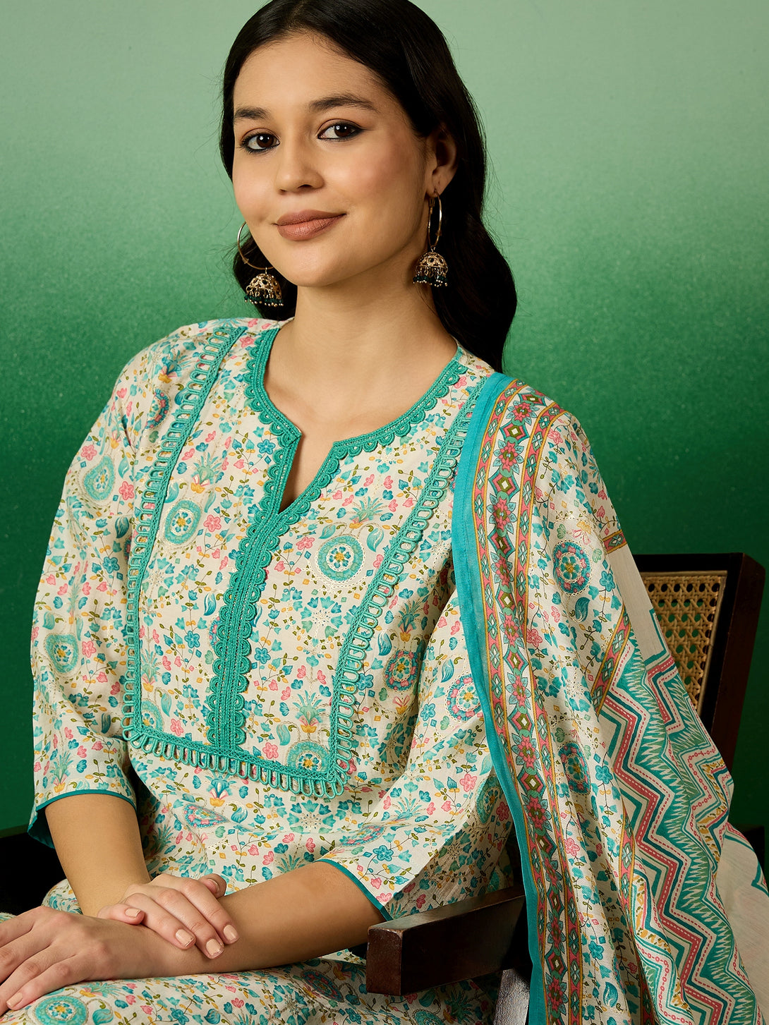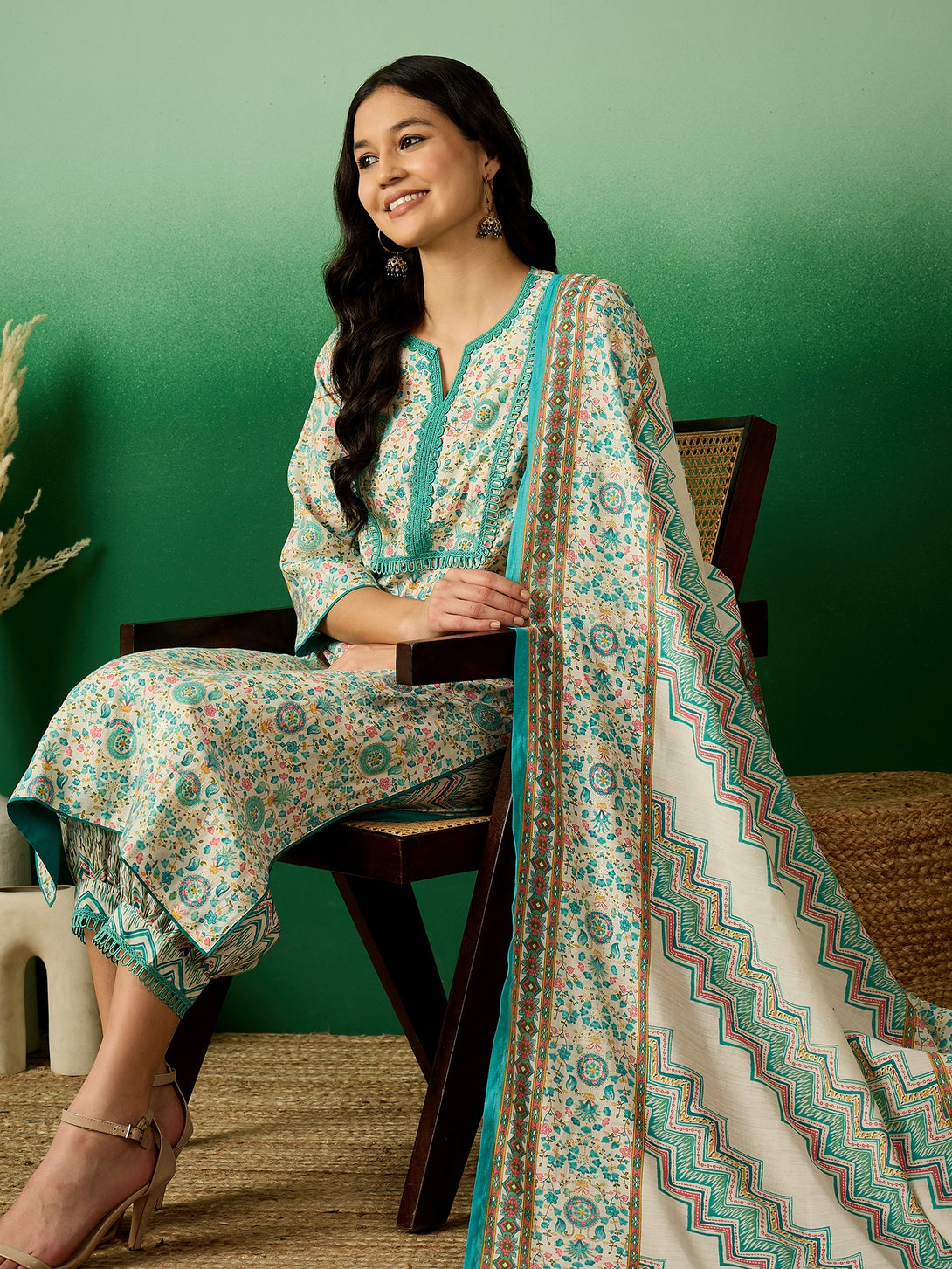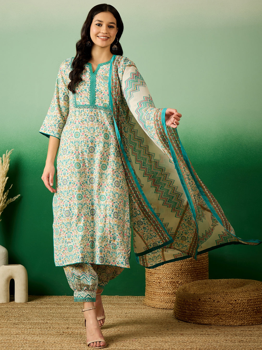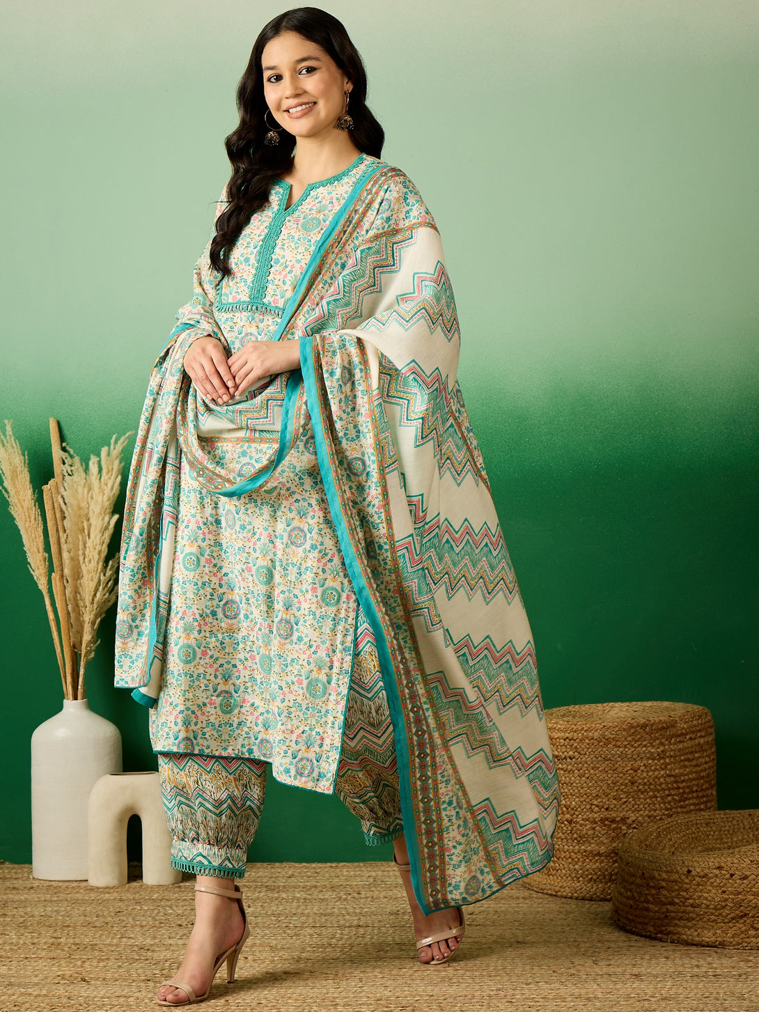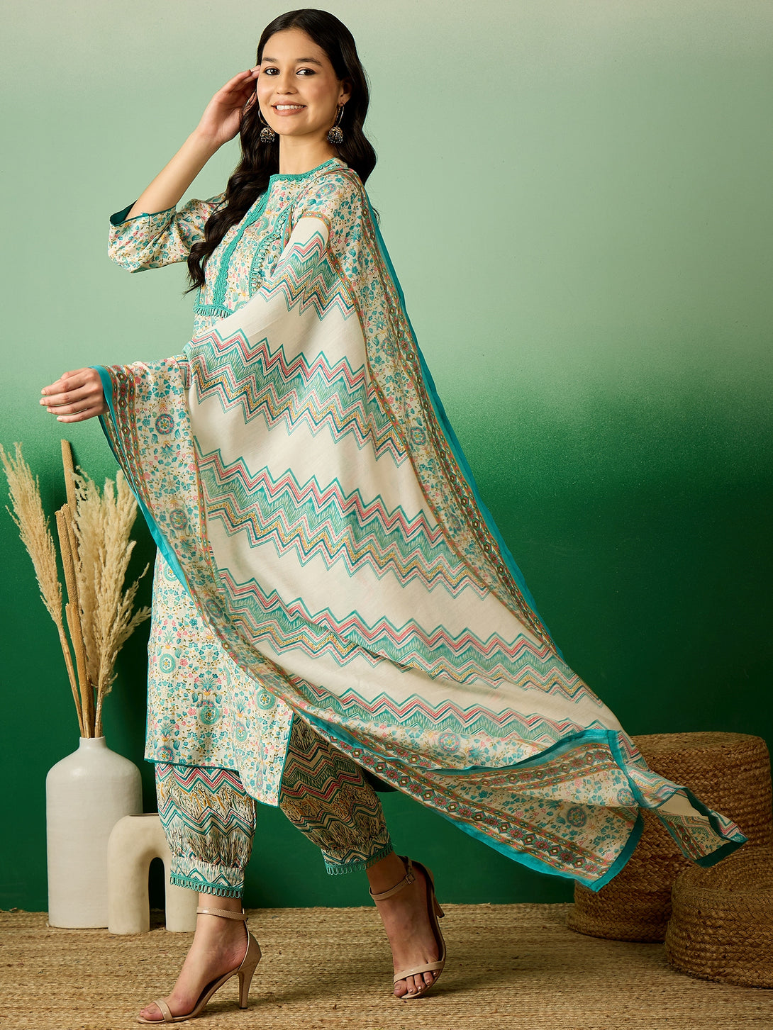 Teal Green Floral Printed Notch Neck Straight Kurta & Afgani Trousers & Dupatta