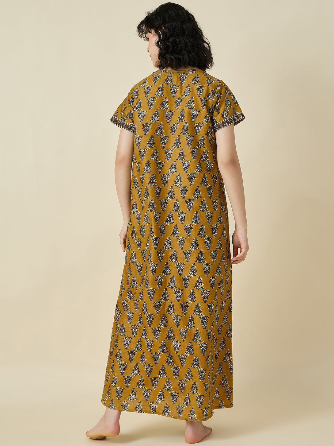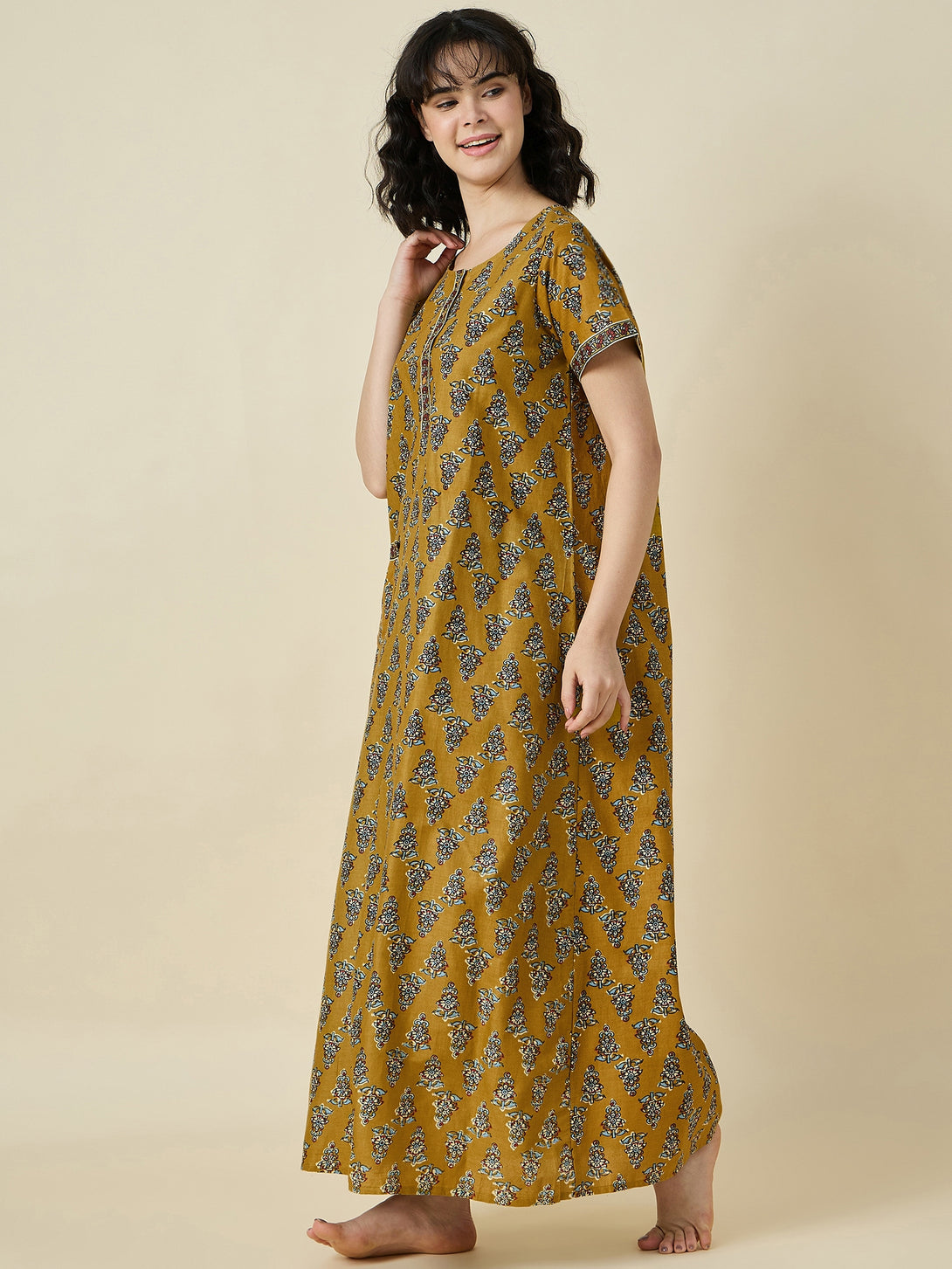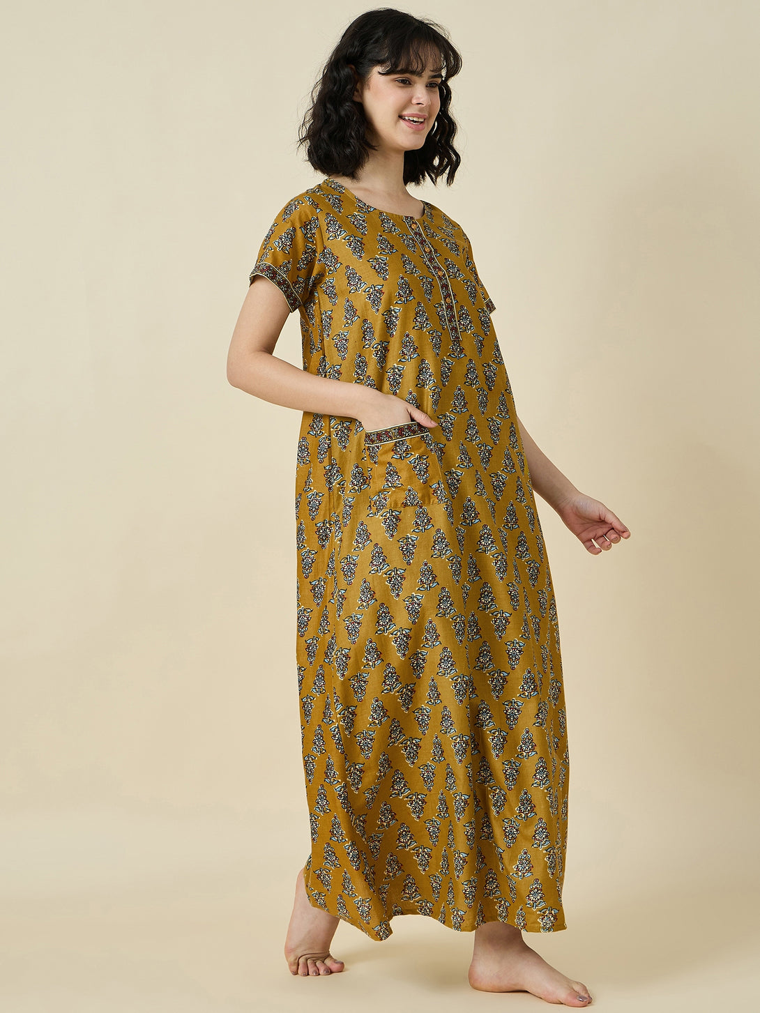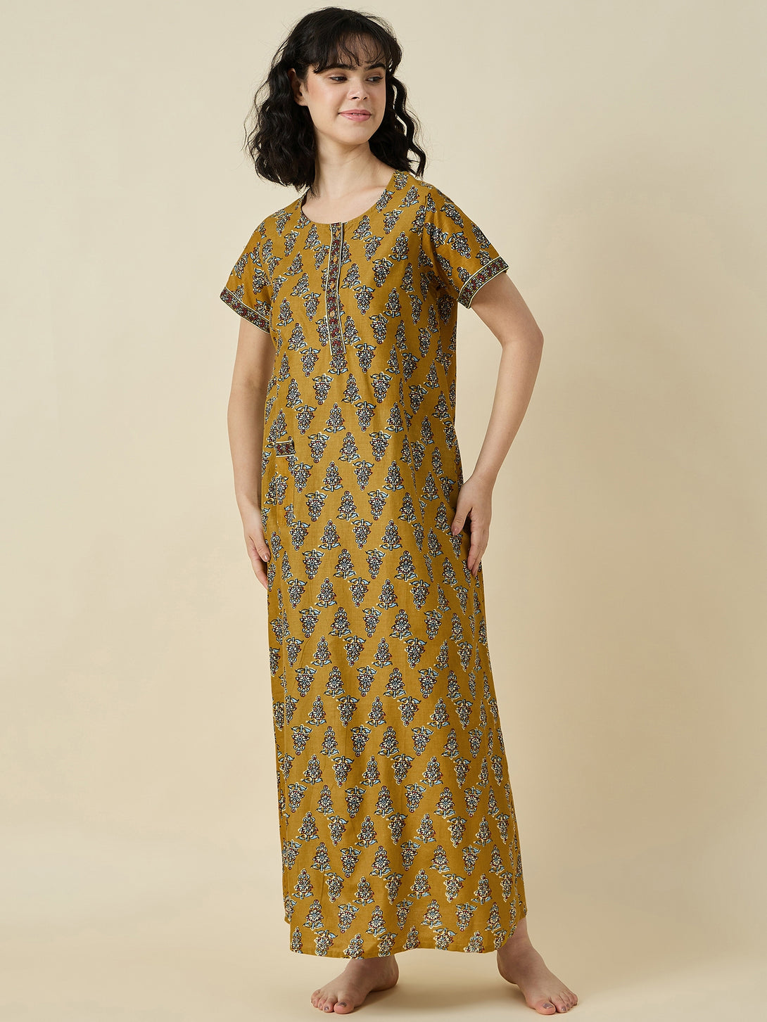 Midnight Bloom Beige Pure Cotton Full Length Printed Gowns With Functional Side Pockets