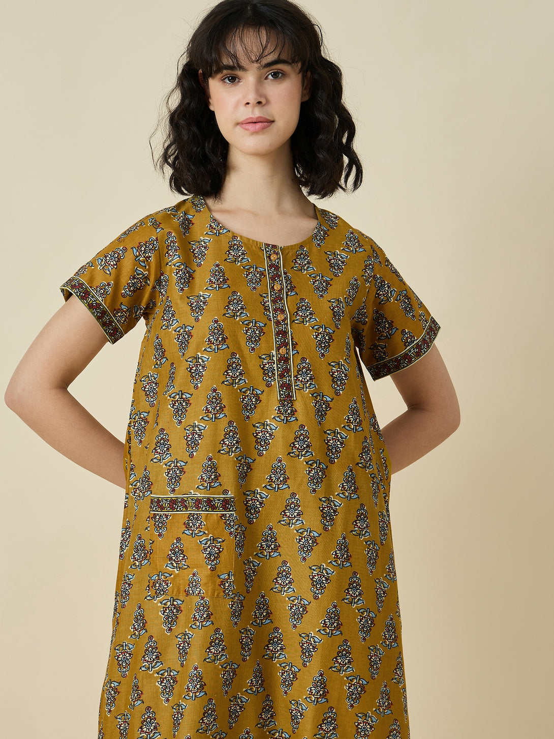 The rich black base is beautifully contrasted with an all-over floral print in subtle tones of cream, olive, and soft yellow, giving it a timeless and calming aesthetic. The round neckline is accented with delicate piping and a vertical stitched placket that adds a touch of sophistication. Short sleeves provide ease of movement while enhancing the overall relaxed vibe of the dress.