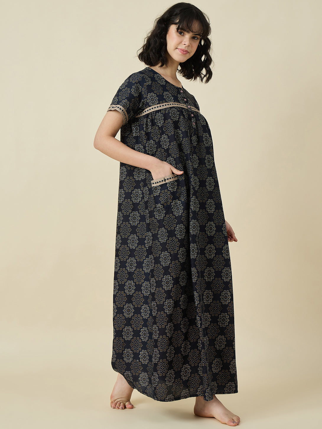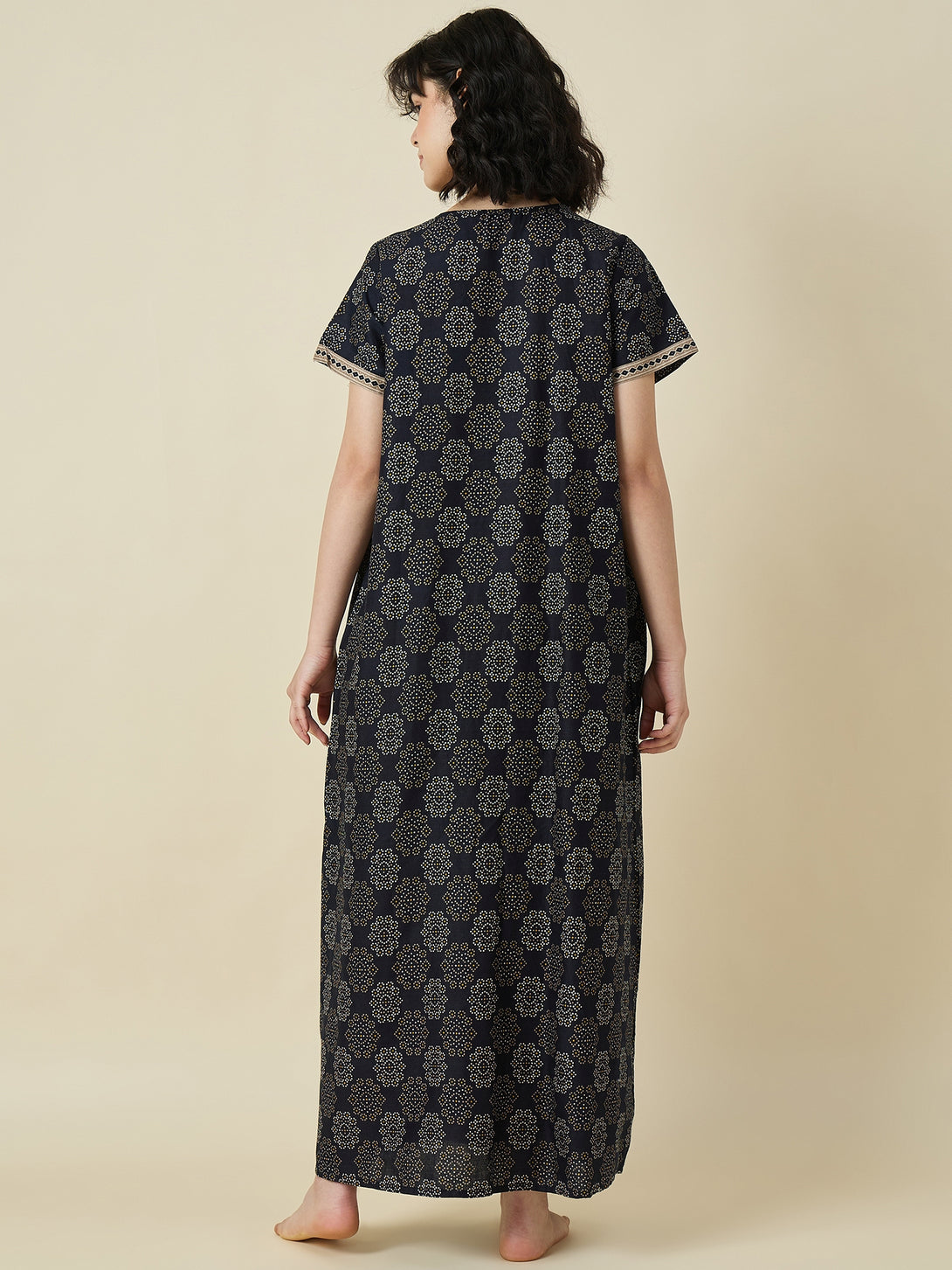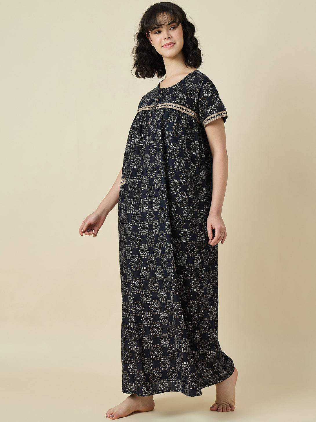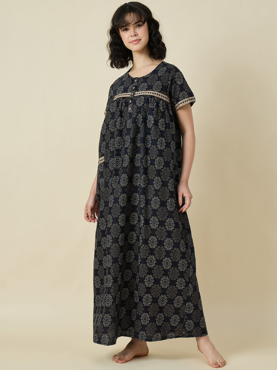 Whether you're sipping your morning tea or winding down after a long day, the Midnight Bloom Cotton Maxi Nightdress will become your go-to favorite. It's low maintenance, machine washable, and retains its softness and shape after every wash, making it a practical addition to your wardrobe.