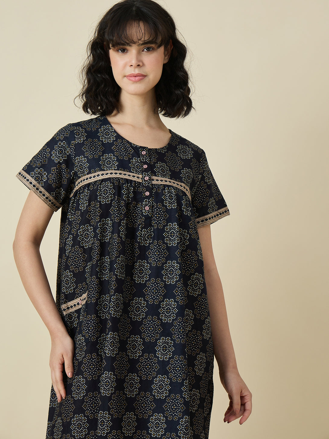 The rich black base is beautifully contrasted with an all-over floral print in subtle tones of cream, olive, and soft yellow, giving it a timeless and calming aesthetic. The round neckline is accented with delicate piping and a vertical stitched placket that adds a touch of sophistication. Short sleeves provide ease of movement while enhancing the overall relaxed vibe of the dress.