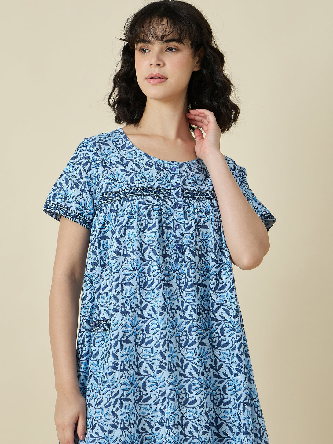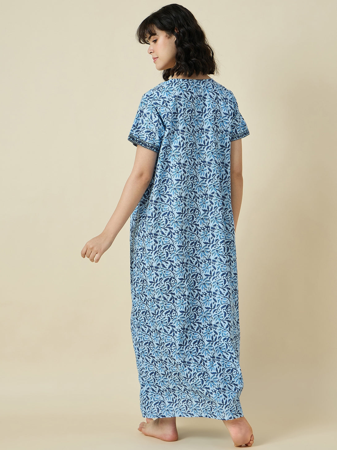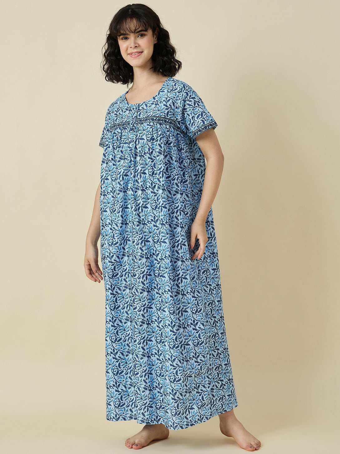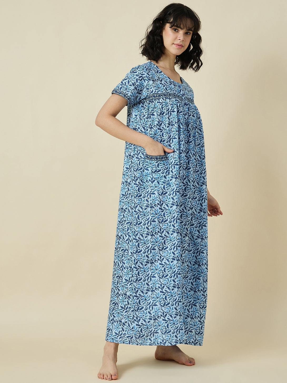 Midnight Bloom Blue Pure-Cotton Full Length Printed Gowns With Functional Side Pockets