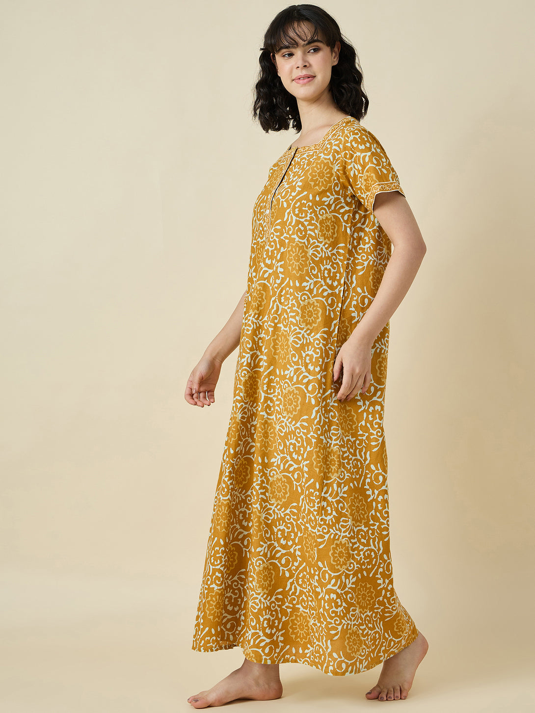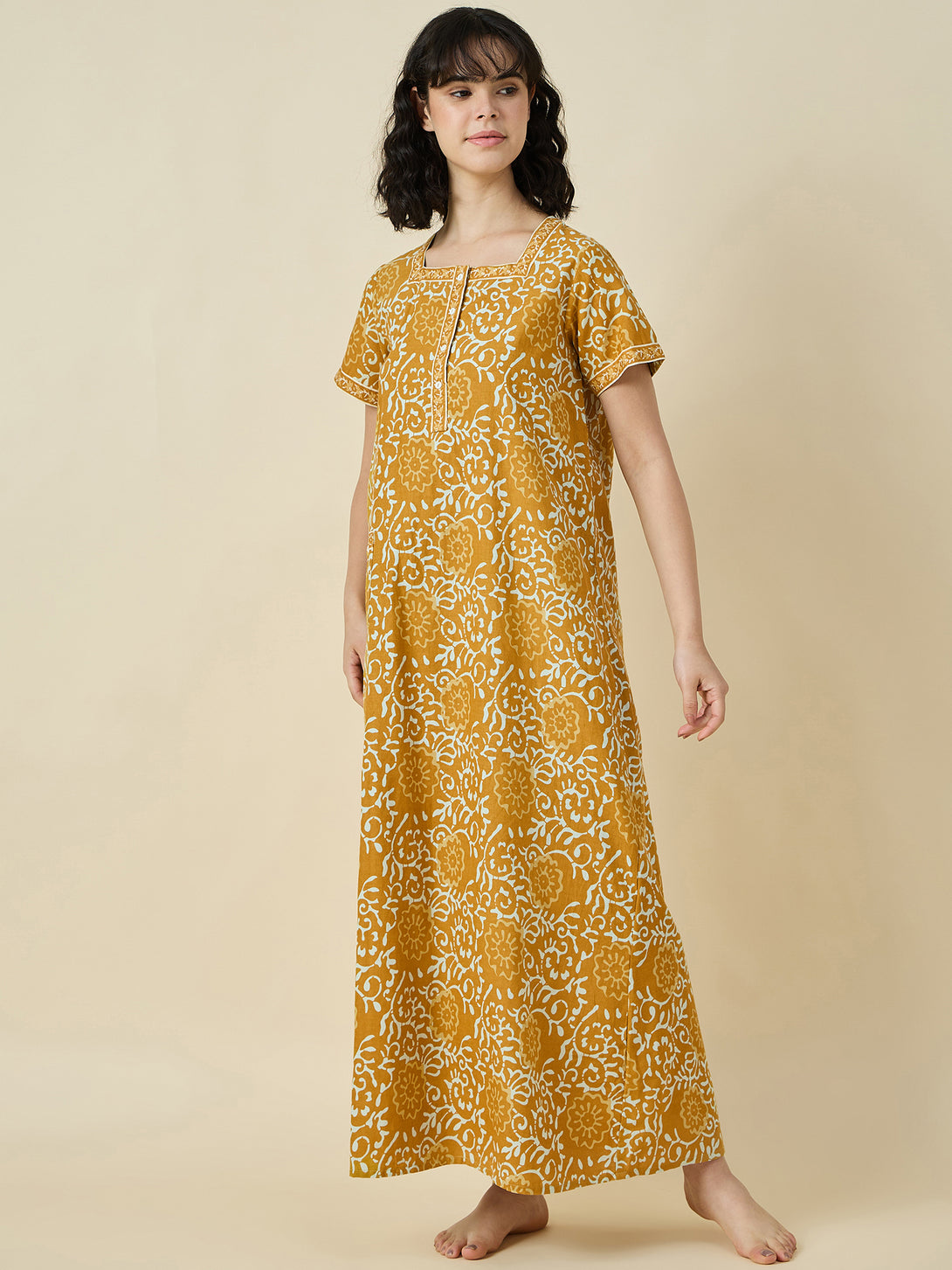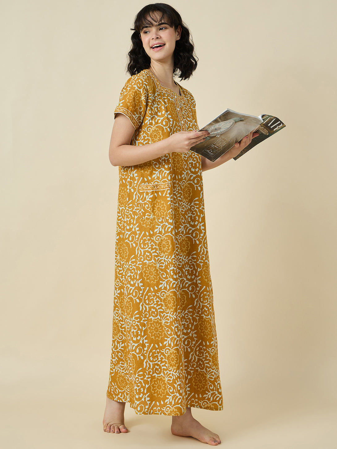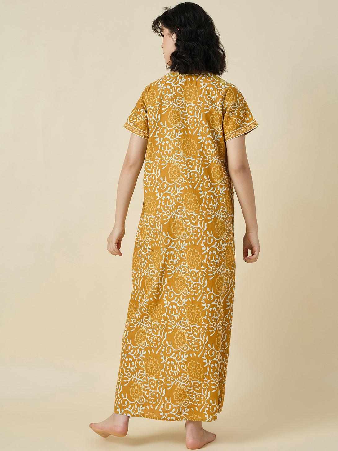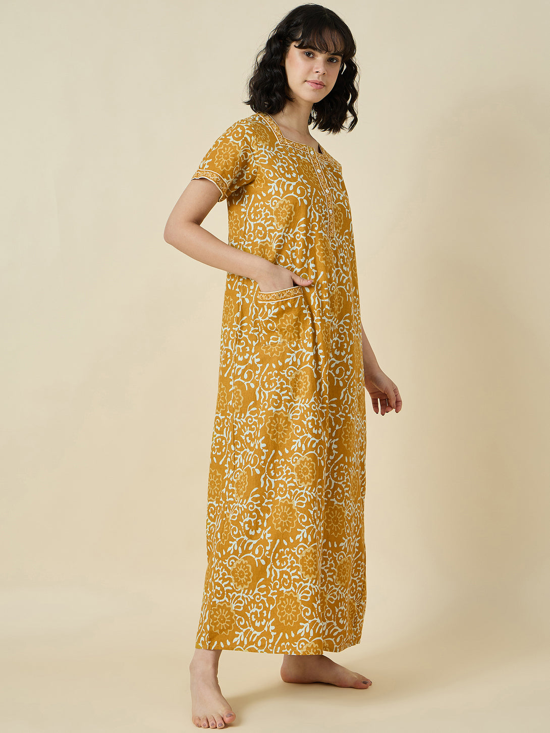 Midnight Bloom Yellow Pure Cotton Full Length Printed Gowns With Functional Side Pockets